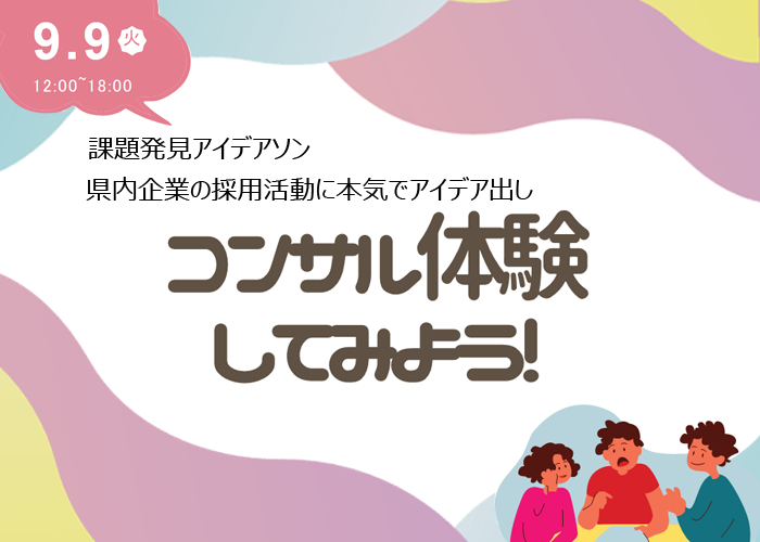 9月9日(火)に「課題発見アイデアソン 県内企業へ本気でアイデア出し!コンサル体験してみよう」を開催いたします。