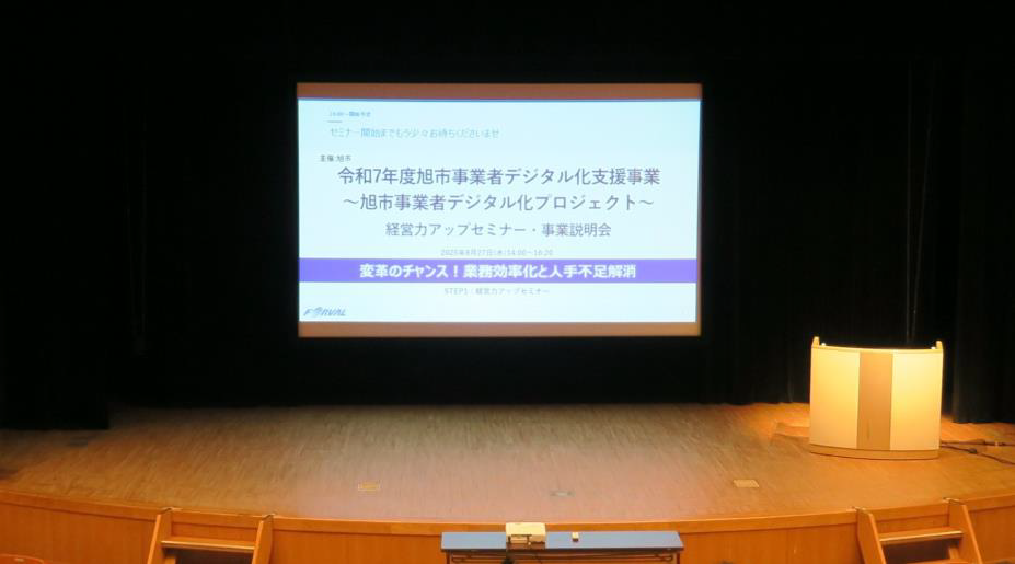 千葉県旭市より「令和7年度旭市事業者デジタル化支援事業」を受託し、パートナー企業である株式会社トップと共同で運営を行っています。その一環として、2025年8月27日、旭市主催・フォーバル運営による「経営力アップセミナー」を東総文化会館にて開催いたしました(オンライン同時配信)。